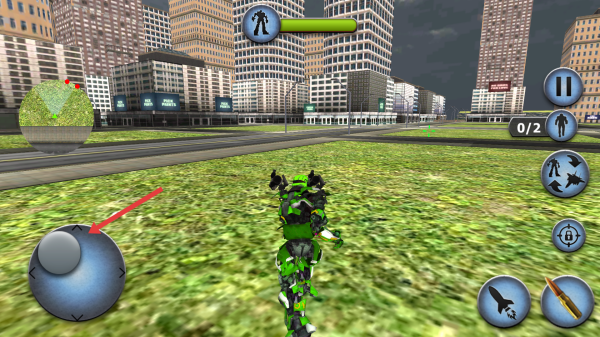 1、用左側(cè)的搖桿控制機(jī)甲的移動(dòng),前往小地圖查看紅點(diǎn)標(biāo)記區(qū)域,向前移動(dòng)尋找敵人敵方的機(jī)甲。