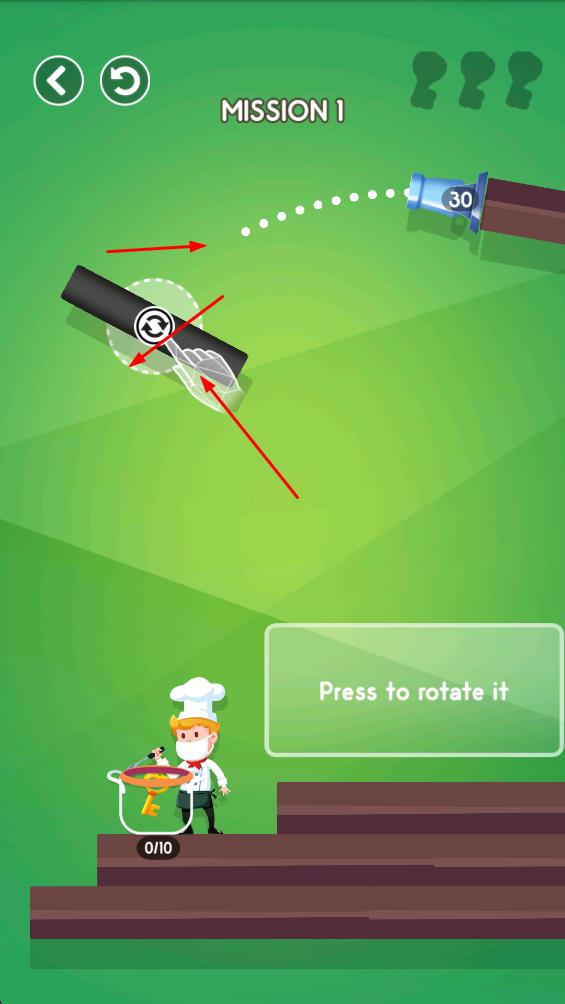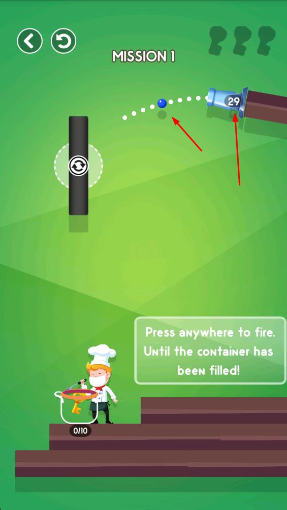 3、使彩球經(jīng)黑色物件阻擋后,落入廚師前方容器,達(dá)成收集數(shù)量目標(biāo)。