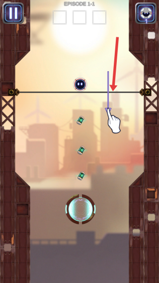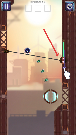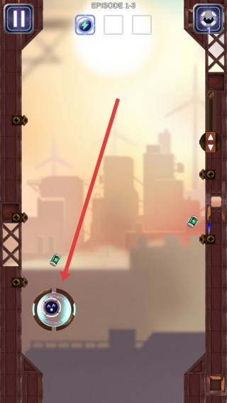 2、遇到可移動(dòng)機(jī)關(guān)到綠色的光柱,拖動(dòng)調(diào)整位置,切斷線條,輔助小球跨越線條障礙,收集全部的電池。