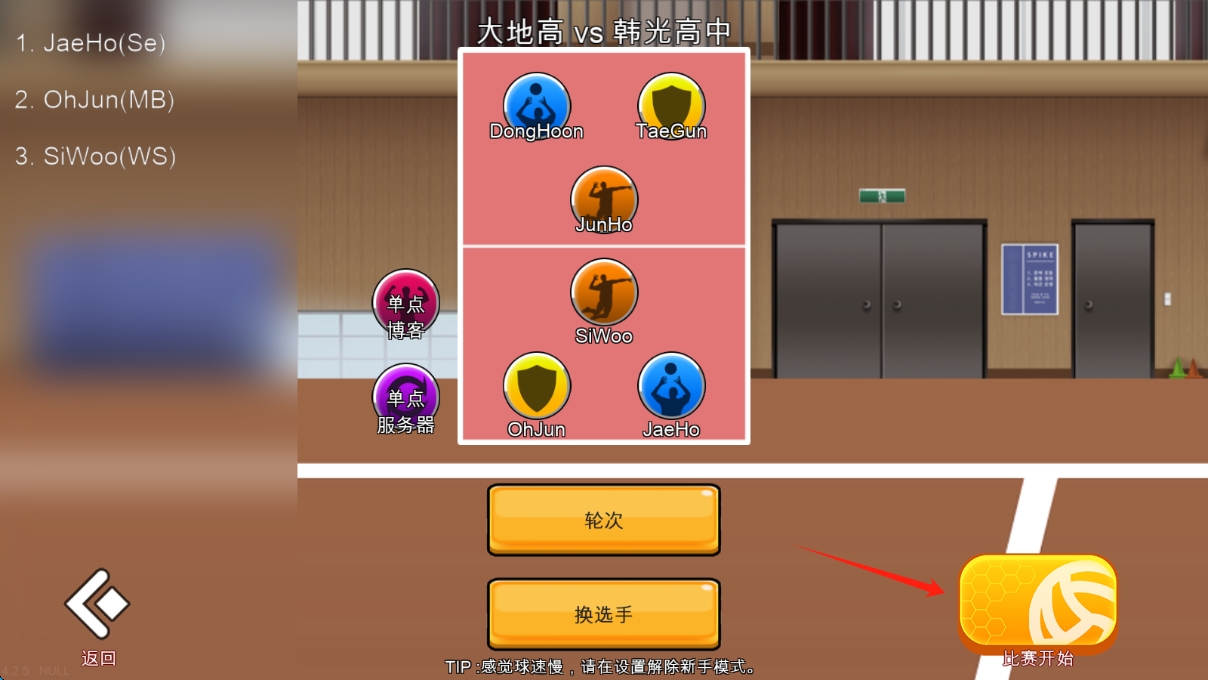 1、賽前界面,確認(rèn)選手布陣,點(diǎn)擊比賽開(kāi)始,開(kāi)啟排球?qū)?zhàn),點(diǎn)擊按鈕使比賽開(kāi)始。
