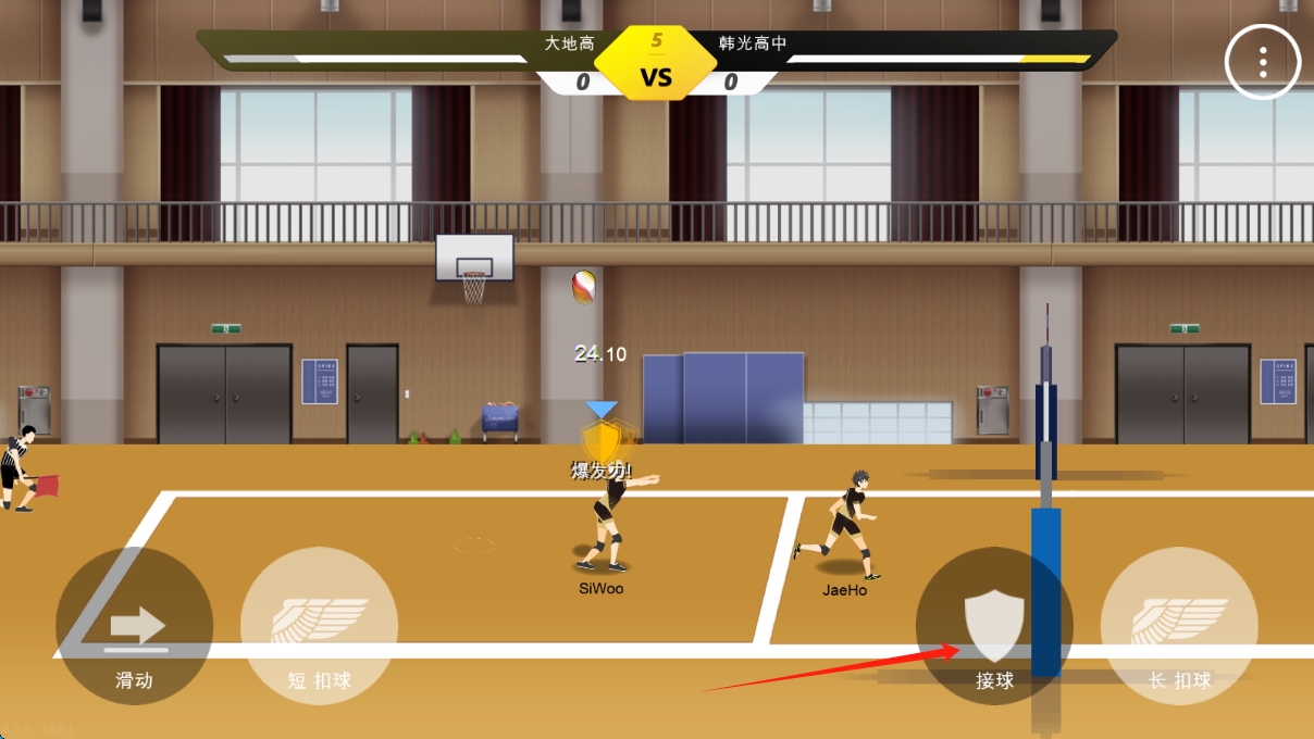 2、比賽時(shí),根據(jù)球的軌跡,用接球按鍵防守,扣球按鍵進(jìn)攻,點(diǎn)擊按鈕接住比賽的球。