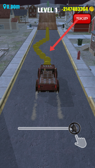 1、開局駕駛紅色卡車沿著道路上的黃色金幣軌跡行駛,通過虛擬方向盤操控方向,盡可能的多收集金幣。