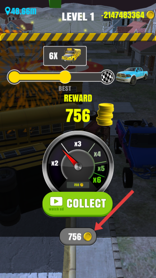 3、關(guān)卡結(jié)束后,點(diǎn)擊顯示756金幣的按鈕,領(lǐng)取獎(jiǎng)勵(lì)金幣,可以用于后續(xù)車輛升級(jí)和開局購(gòu)買道具。