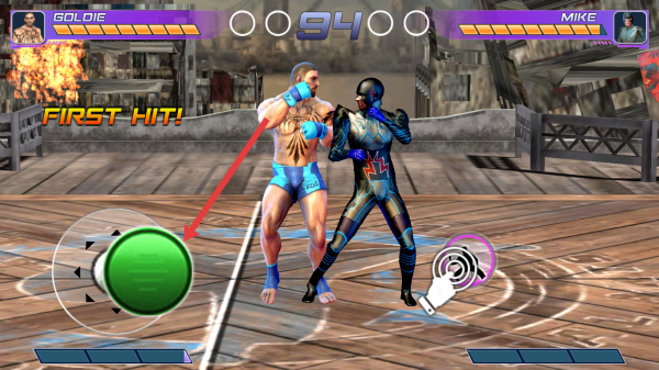 3、戰(zhàn)斗中通過左側(cè)虛擬搖桿操控角色移動,搭配攻擊操作,與對手展開格斗,全力爭取勝利。