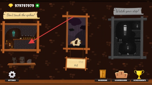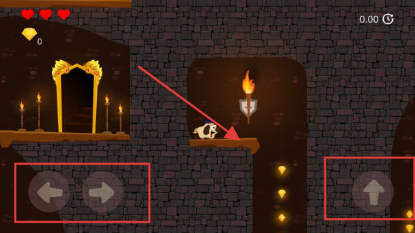 2、在關(guān)卡選擇,選箭頭指向關(guān)卡,進(jìn)入地宮,按提示操控狗狗,利用左右、跳躍鍵,避開尖刺,收集鉆石。