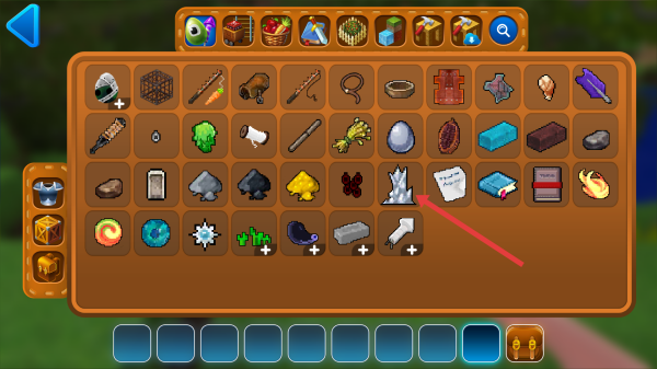 2、打開背包棕色包,整理工具、資源,長按物品拖到快捷欄,方便使用如鎬子挖礦、斧子砍樹。
