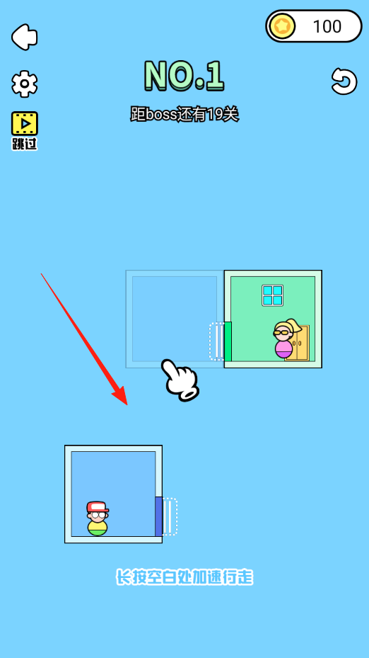1、進入第1關(guān),看到兩個房間,按提示長按空白處讓角色加速走,把下面房間的滑塊拖到上面,連通路徑,讓角色走到有NPC的房間,完成關(guān)卡挑戰(zhàn),記得長按加速能更快通關(guān)。