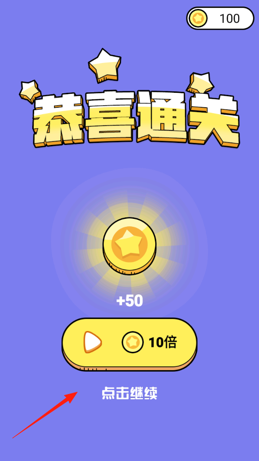 2、通關(guān)后,彈出獎勵界面,拿到50金幣,想繼續(xù)玩下一關(guān),點點擊繼續(xù),想賺更多金幣,看廣告領(lǐng)10倍獎勵,選好后進入下一關(guān),接著挑戰(zhàn)。