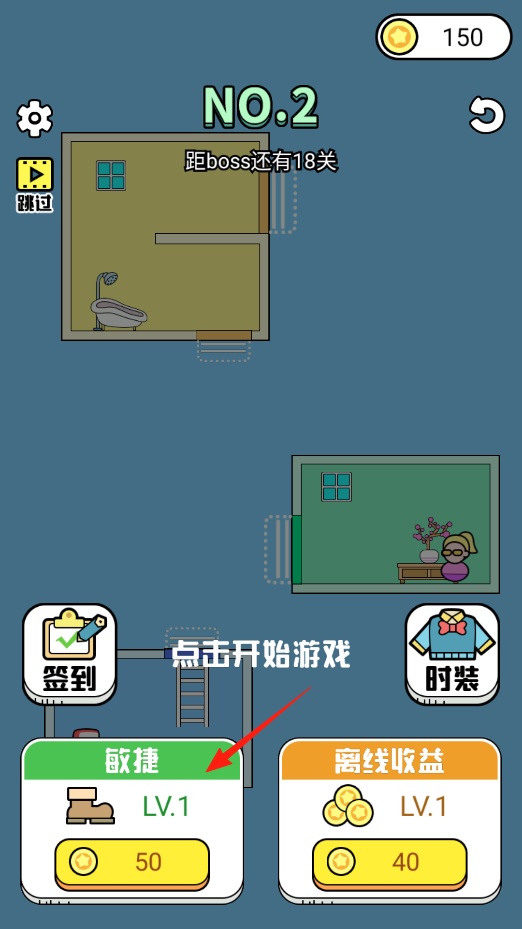 3、到第2關(guān)界面,有敏捷,離線收益等升級項,點敏捷下面的按鈕,花50金幣升級,提升角色移動速度,讓后續(xù)關(guān)卡跑得更快方便通關(guān),升級后點點擊開始游戲接著玩。
