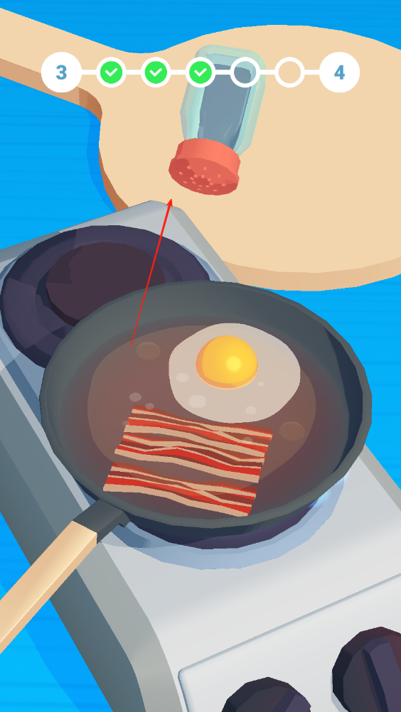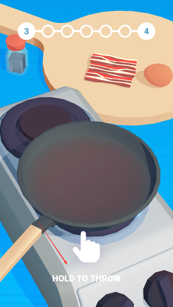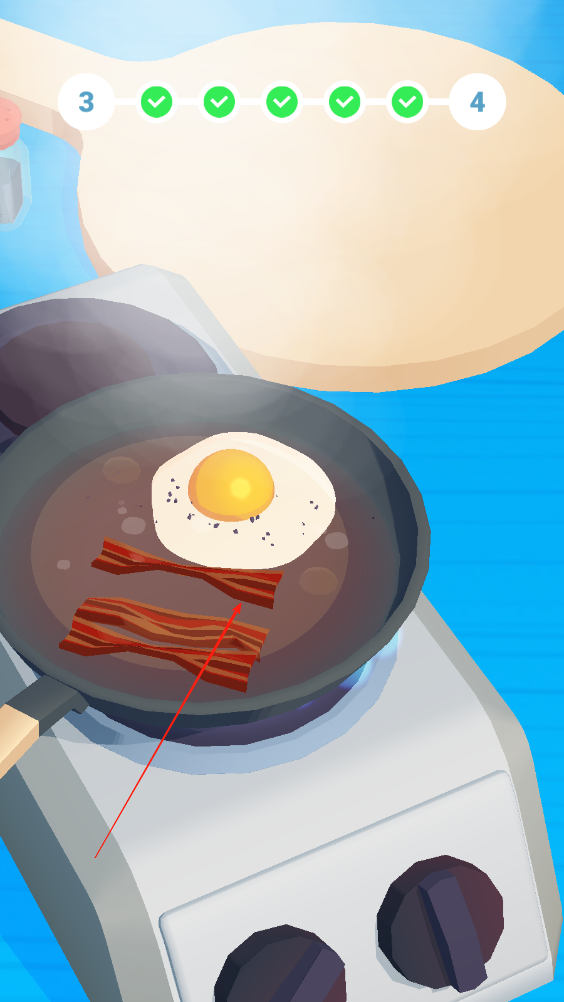 1、長(zhǎng)按屏幕下方的位置,把食材如雞蛋、培根等投進(jìn)鍋中,長(zhǎng)按即可開(kāi)始烹飪,先煎培根再到煎蛋。