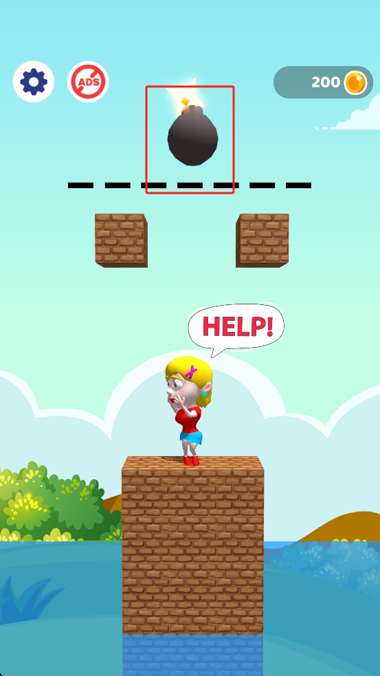 1、觀察炸彈位置與虛線,點擊移除虛線讓炸彈掉落,避開女孩上方,利用磚塊阻擋,使炸彈不威脅女孩的安全。