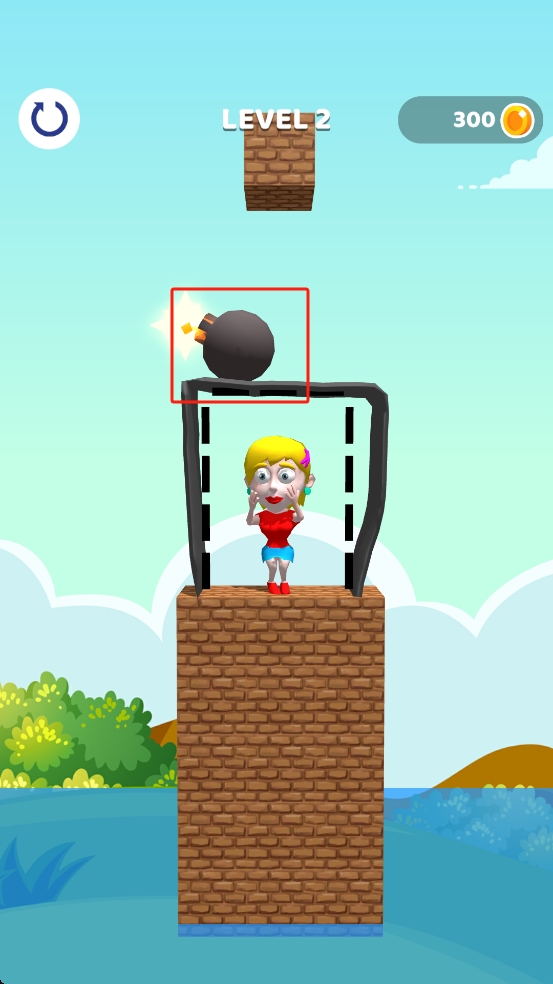 2、看炸彈和框架結(jié)構(gòu),移除障礙虛線,引導(dǎo)炸彈遠(yuǎn)離女孩所在框架,保護(hù)女孩同時注意金幣數(shù)量。