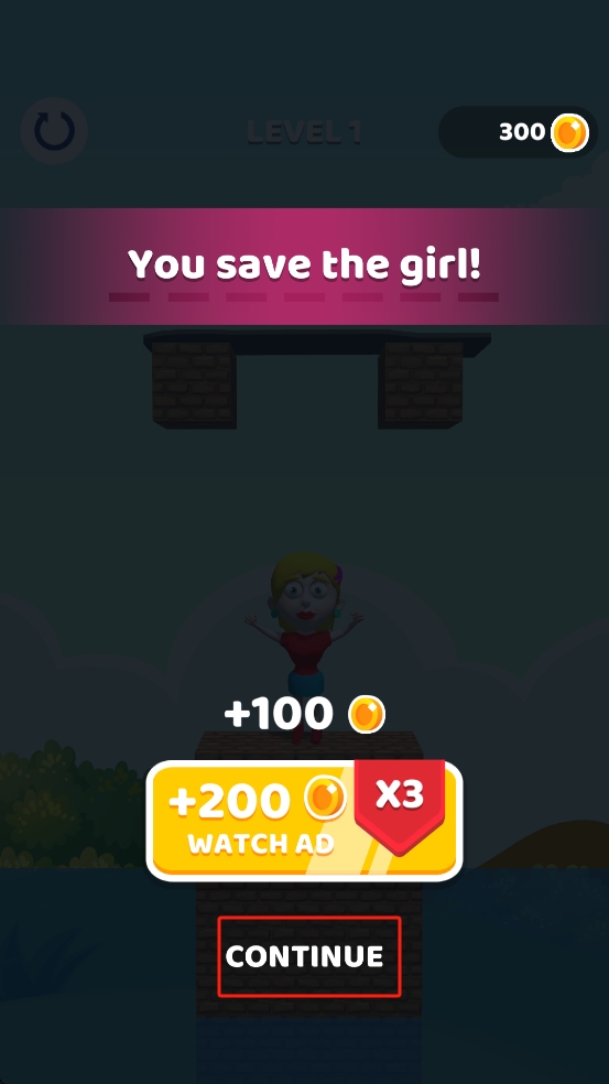 3、成功救女孩后,界面顯示獲100金幣,我們可以點CONTINUE進(jìn)下一關(guān),或看廣告來翻倍金幣。