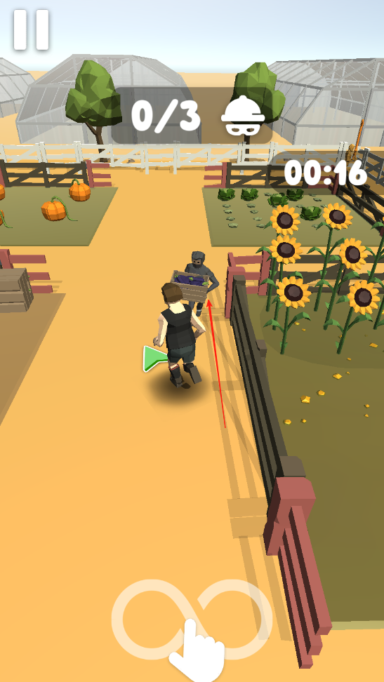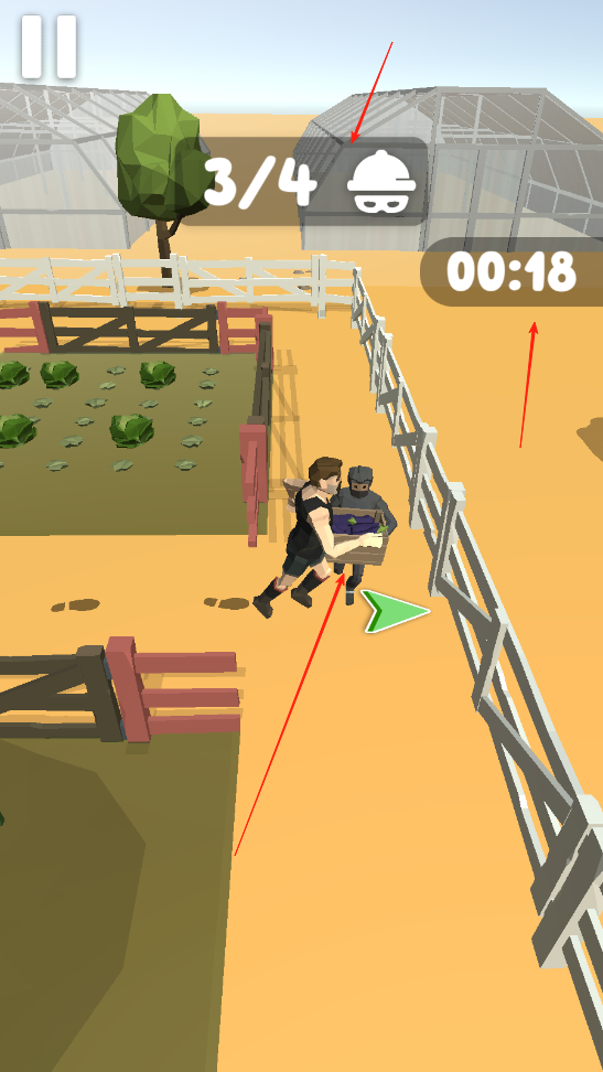 1、操控角色追逐在農(nóng)場(chǎng)里偷菜的的盜賊,沿著箭頭指引方向奔跑,在農(nóng)場(chǎng)里攔截他們,每抓住一個(gè)完成一個(gè)任務(wù)目標(biāo)。