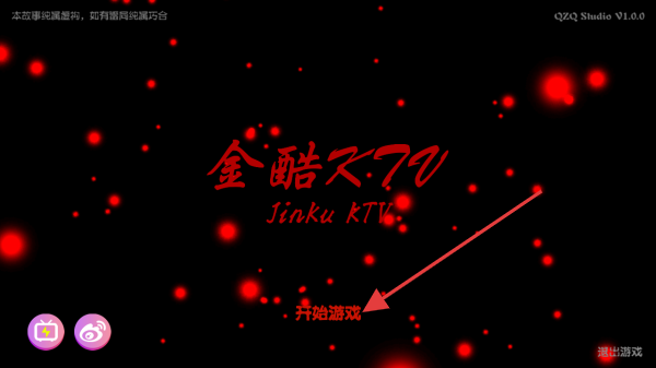 1、打開金酷KTV,點(diǎn)開始游戲,進(jìn)入劇情,留意“本故事純屬虛構(gòu)”提示,開啟KTV解謎冒險(xiǎn)。