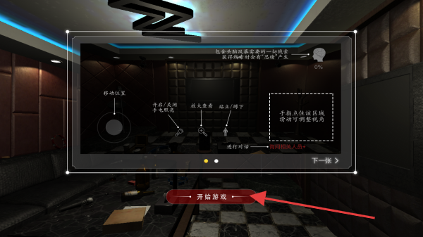 2、在包廂場(chǎng)景,看操作指引移動(dòng)、開關(guān)電筒等 ,熟悉功能后點(diǎn)開始游戲,進(jìn)入探索環(huán)節(jié)。