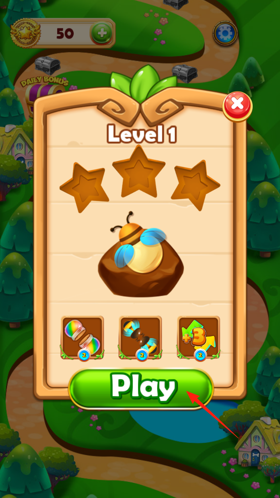 1、進入游戲關(guān)卡選擇,看到Level1界面,有三個星星和小蜜蜂圖案,點Play開始第一關(guān),利用下面的道具,比如彩色瓶子蜜蜂道具,幫你消除方塊,完成關(guān)卡目標。
