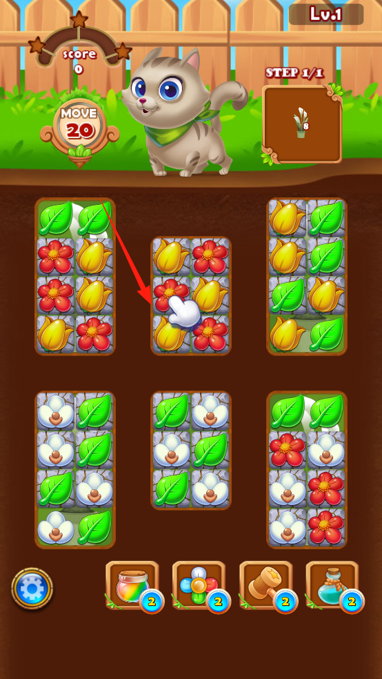 2、第一關(guān)游戲中,按提示交換花朵位置,讓三個及以上同色方塊連一起消除,屏幕上方有步數(shù)限制,要在步數(shù)內(nèi)消夠目標,小貓咪在旁邊看著,消完方塊推進關(guān)卡。