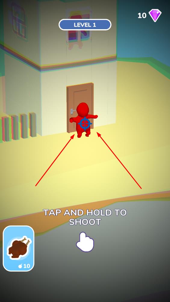 1、進(jìn)入關(guān)卡界面,點(diǎn)擊按住屏幕瞄準(zhǔn)紅色小人,選定投擲角度,準(zhǔn)備釋放道具。