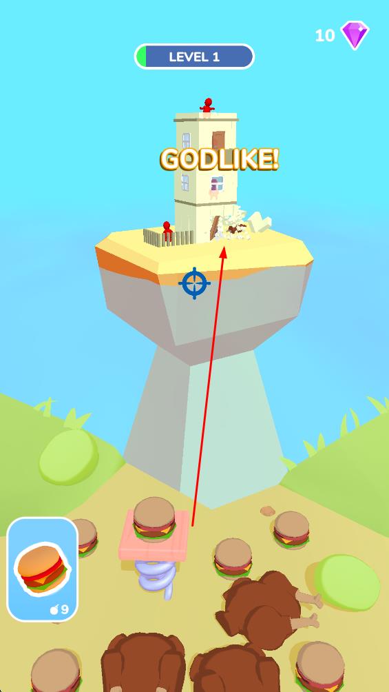2、釋放雞腿、漢堡等道具,投擲至建筑區(qū)域,借助沖擊破壞建筑結(jié)構(gòu),攻擊目標(biāo)。