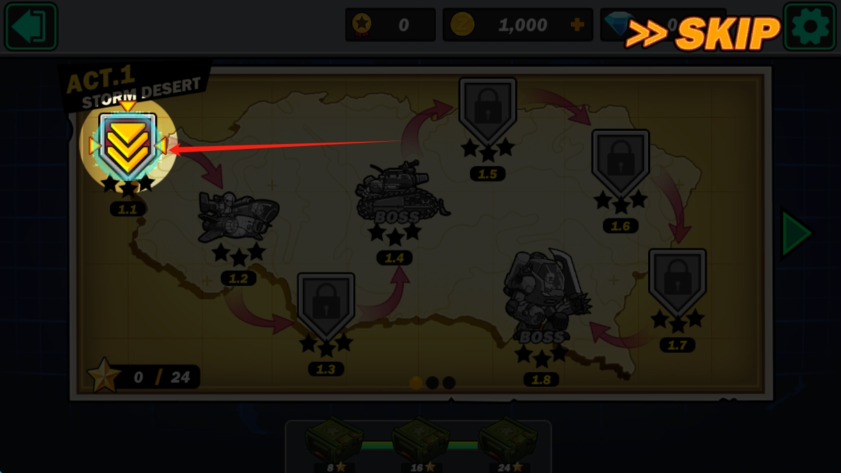 2、在關(guān)卡選擇界面,點(diǎn)擊ACT.1STORMDESERT下的1.1關(guān)卡,開(kāi)啟戰(zhàn)斗任務(wù),點(diǎn)擊選擇關(guān)卡。