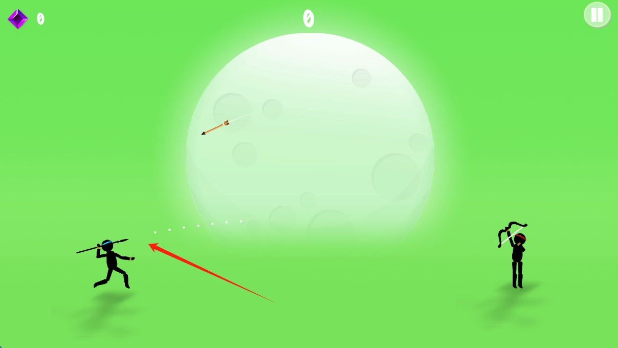 2、戰(zhàn)斗時觀察敵人位置,點擊屏幕操控火柴人投擲長矛,精準攻擊對手,點擊瞄準敵人。