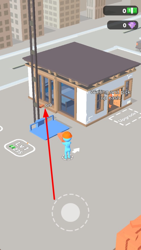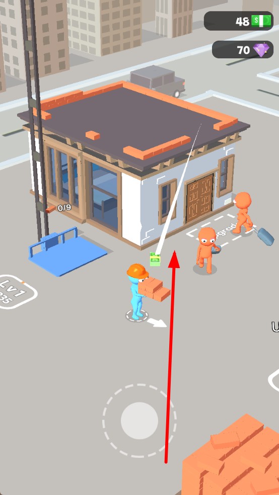 1、開(kāi)局操控藍(lán)工人搬運(yùn)磚塊,跟隨建筑進(jìn)度條,向房屋填充建材,完成平房主體搭建,開(kāi)啟經(jīng)營(yíng)第一步。