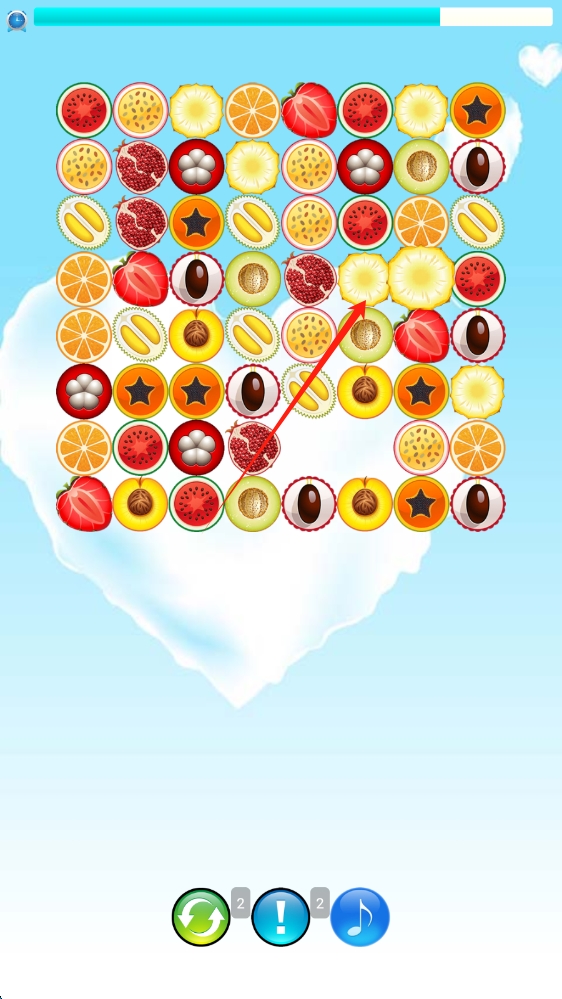 2、游戲關(guān)卡中,尋找并連接相同水果圖案,消除得分,注意時(shí)間限制,點(diǎn)擊相同的消除。