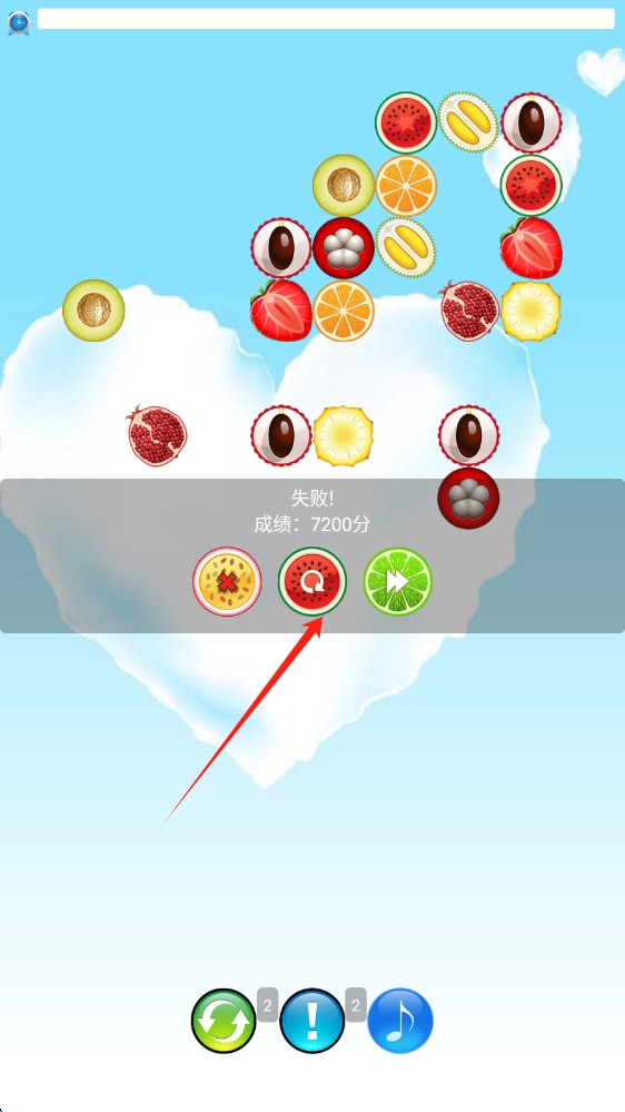 3、若挑戰(zhàn)失敗,點(diǎn)擊失敗界面西瓜圖標(biāo),重新開始極速模式關(guān)卡,點(diǎn)擊按鈕重開關(guān)卡。