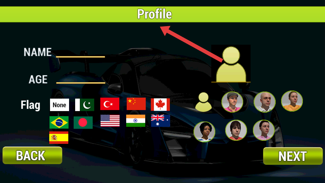 1、在Profile界面,填寫NAME和AGE欄目的信息,從下方國旗選項(xiàng)與頭像中挑選設(shè)定,完成后點(diǎn)擊右下角NEXT按鈕,確定車手的身份信息。