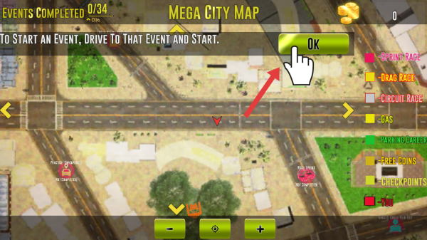 2、進(jìn)入MEGA CITY MAP界面,點(diǎn)擊OK按鈕確認(rèn)規(guī)則提示,依據(jù)右側(cè)SPRINT RACE、DRAG RACE等賽事標(biāo)識,駕駛車輛前往對應(yīng)賽事地點(diǎn)。