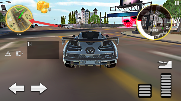 3、駕駛車輛過程中,通過左下角左右箭頭按鍵操控方向,右側(cè)踏板按鍵實(shí)現(xiàn)加速,參照左側(cè)小地圖的綠色路線指引,朝著目標(biāo)賽事點(diǎn)行駛。