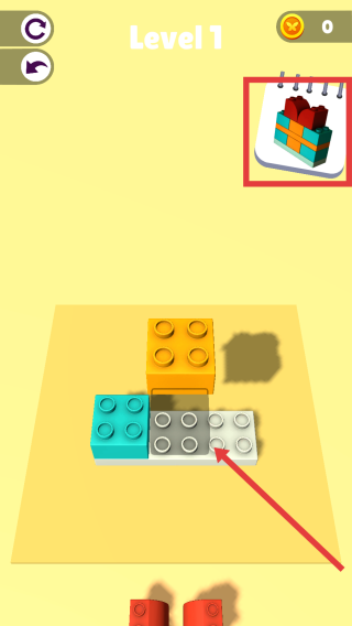 2、拖拽下方方塊,對(duì)照右上角圖案的顏色與位置,精準(zhǔn)拼接組合,完成Level-1的積木造型搭建任務(wù)。