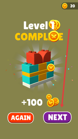 3、Level-1完成后,點(diǎn)擊紫色NEXT按鈕,領(lǐng)取20金幣與100獎(jiǎng)勵(lì),進(jìn)入下一關(guān)延續(xù)積木搭建挑戰(zhàn)。