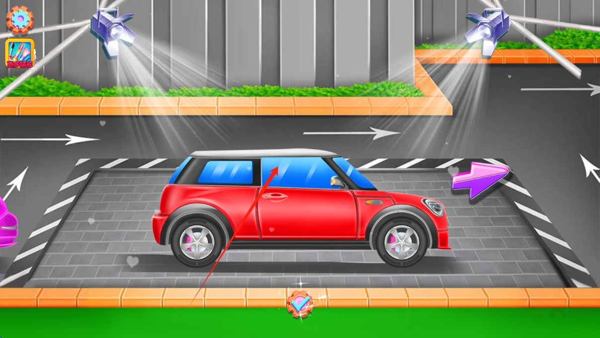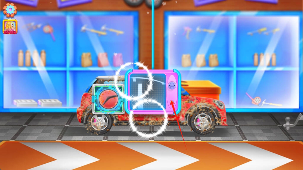 3、進入維修環(huán)節(jié),點擊汽車粉色部件區(qū)域,使用對應(yīng)工具對車輛進行清洗和維修操作。