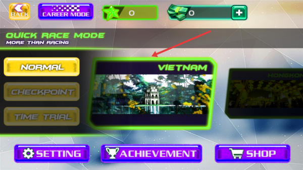1、在游戲模式選擇頁,進(jìn)入QUICK RACE MODE,選VIETNAM賽道,點(diǎn)擊確認(rèn)進(jìn)入該賽道競(jìng)速。