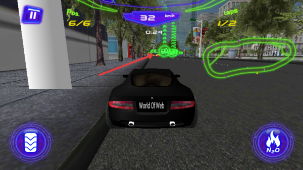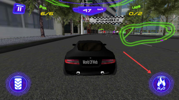 2、駕駛黑色賽車World Of Web在賽道行駛,遇綠色標(biāo)記區(qū)域,按需點(diǎn)擊右下角N?O按鈕加速,提升跑圈效率。