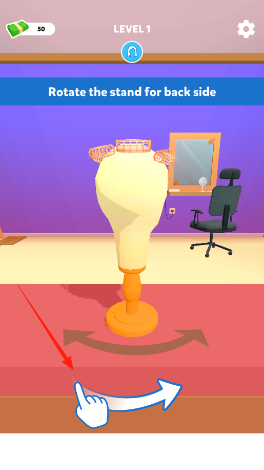 1、進(jìn)入美發(fā)關(guān)卡,根據(jù)提示,用手指拖動卷發(fā)器,在假人頭上滑動,做出發(fā)型,按照箭頭方向,把卷發(fā)器放好,給假人卷頭發(fā),完成第一步美發(fā)操作,看看能做出啥樣的造型。