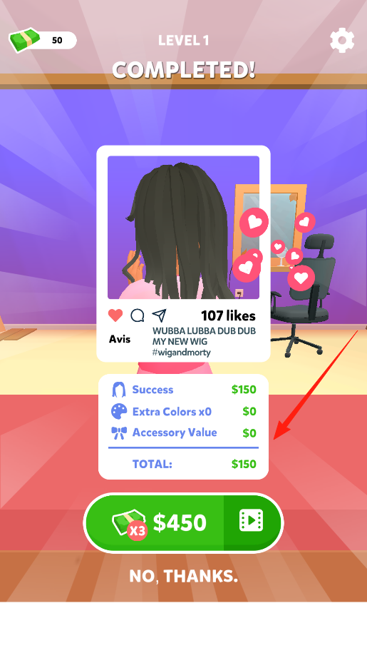 3、完成發(fā)型后,彈出成果界面,能看到顧客曬的新發(fā)型,還有獲得的點贊和獎金,想拿更多錢,點綠色按鈕看廣告翻倍,不想看點NO,THANKS收下150美元,接著下一關(guān)挑戰(zhàn)。