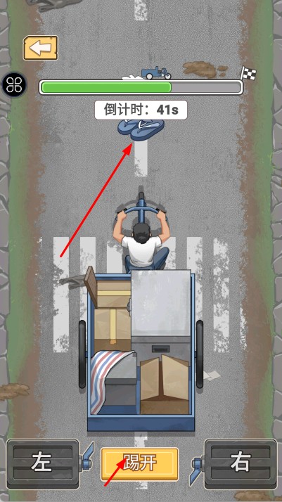 2、點(diǎn)擊出門(mén),在城鎮(zhèn)場(chǎng)景按指引前往地點(diǎn),參與三輪貨運(yùn)任務(wù),根據(jù)提示操作左,右,踢開(kāi)按鈕,躲避障礙、完成運(yùn)輸。