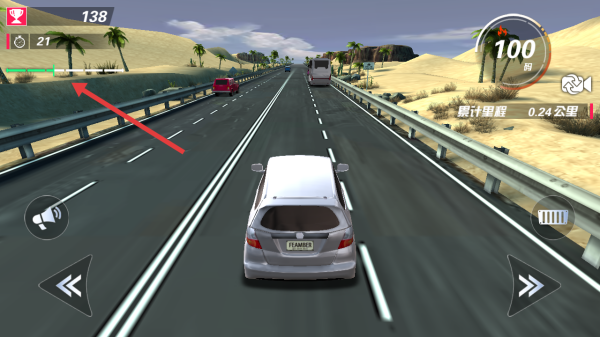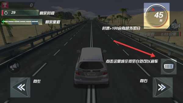 1、進入公路駕駛關卡,按提示點擊空白處剎車,用左右按鍵控方向,保持時速>100爭取額外加分。