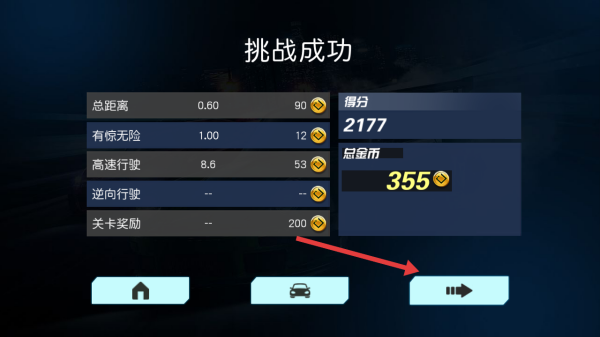 3、挑戰(zhàn)成功后,查看得分、金幣,如355,點擊箭頭按鈕進入下一關,持續(xù)提升駕駛技巧拿更高獎勵。