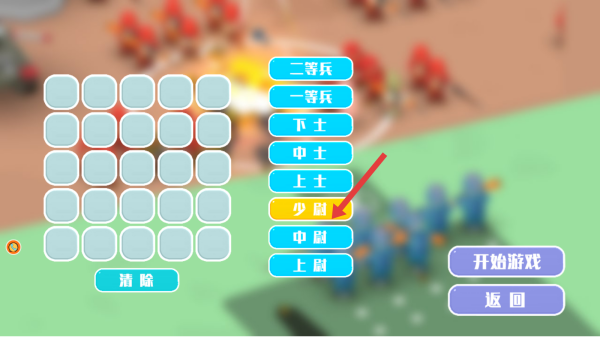 1、進入游戲前,在兵種界面選擇軍銜如少尉等,點擊對應(yīng)方塊布置陣容,確認(rèn)后點開始游戲。
