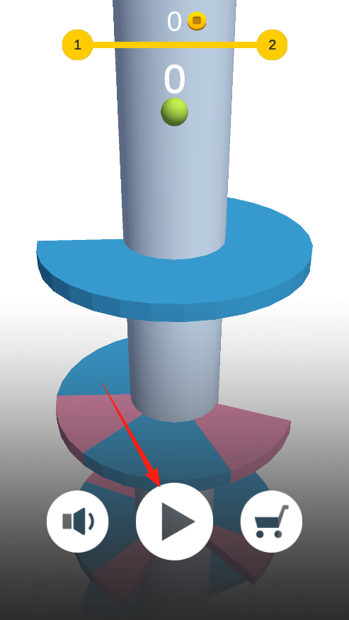 1、打開游戲,看到高塔和綠色小球,點中間播放按鈕,啟動游戲,小球會在高塔軌道上準(zhǔn)備跳躍,準(zhǔn)備好旋轉(zhuǎn)高塔,讓小球找空位下落,開始挑戰(zhàn)。