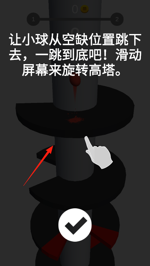 2、游戲開始,看提示讓小球從空缺位置跳下去,滑動屏幕旋轉(zhuǎn)高塔,調(diào)整位置,讓小球從缺口跳下,一層一層往下落,別讓小球碰到障礙,爭取一跳到底,考驗手速和反應(yīng)。