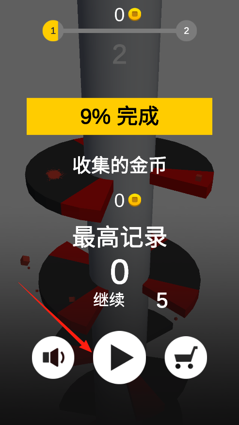 3、小球掉落失敗或成功后,顯示進度和金幣,想再玩,點中間播放按鈕,重新挑戰(zhàn),想調(diào)整聲音,點喇叭按鈕,或者去商店逛逛,每次重玩,試試新的旋轉(zhuǎn)技巧,打破最高記錄。