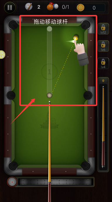 1、開局后按住球桿滑動,調(diào)整擊打方向和力量,對準要擊中的彩球。