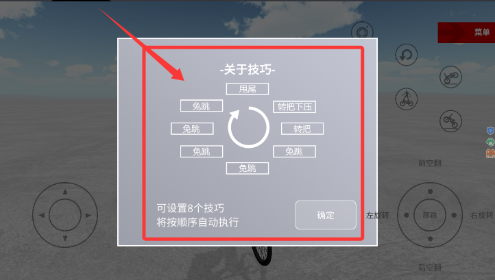 1、游戲開始后,可在技能配置界面選擇甩尾、轉把等動作,最多支持8種組合。