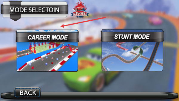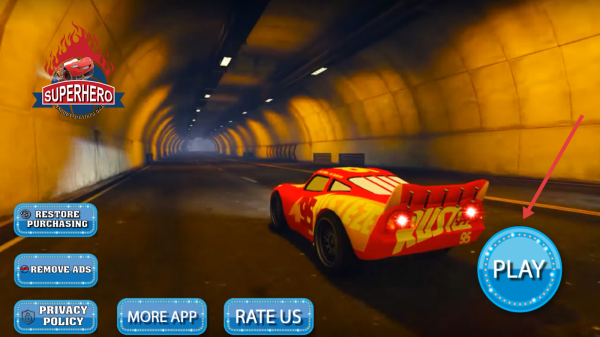 1、在SuperHero賽車游戲主界面,點(diǎn)擊藍(lán)色PLAY按鈕,進(jìn)入模式選擇頁(yè)開(kāi)啟游戲。