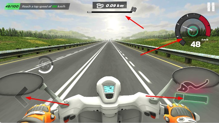 2、點擊RACE開始比賽,駕駛摩托車在道路行駛,通過屏幕操作控制方向、加速,達(dá)成任務(wù)目標(biāo)。
